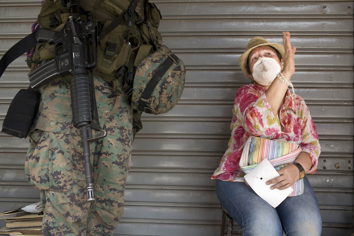 Sonia Macías, vecina del centro de Portoviejo, sostiene una conversación con un militar destacado en la zona, mientras espera la demolición de su casa ya inservible y el rescate de sus pertenencias. Foto: Edú León.