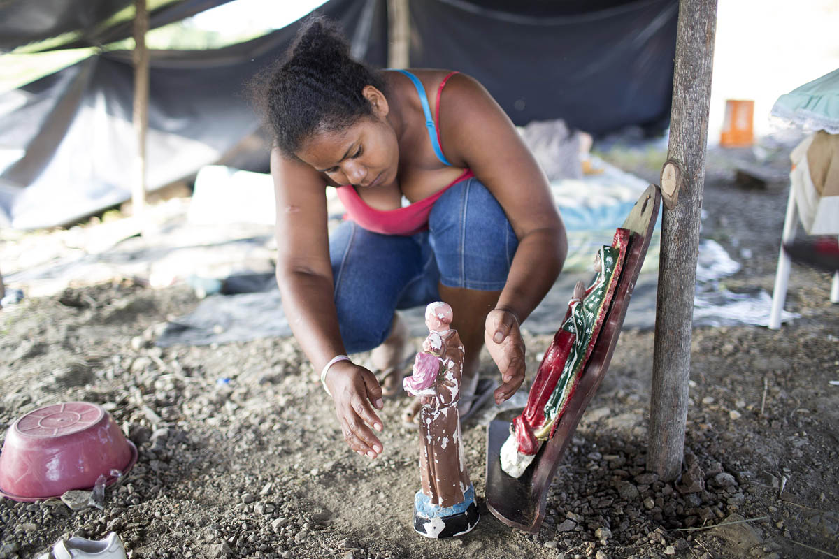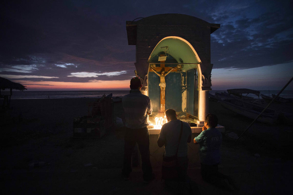 Un grupo de afectados reza a la imagen de una virgen en el malecón de Pedernales. Es el tercer día después del terremoto. Los afectados intentan reconstruir sus vidas y los servicios de rescate intentan aún recuperar supervivientes. Foto: Edú León.