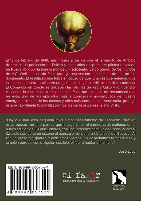Los que siembran el viento, la novela más quiteña que jamás haya leído, llegó a mis manos vía el Cono Sur. Javier Arano, cineasta argentino, me escribió hace siete años para ver si nos podíamos reunir. Él estaba viviendo en Quito y la familia de su esposa ecuatoriana le había contado la historia del truncado aterrizaje marciano en la capital. Le pareció imposible que alguien no hubiera hecho una película sobre el tema. Preguntó y, cuando confirmó que no había un largometraje de ficción ni un documental sobre la versión radial de La guerra de los mundos en Ecuador, decidió que él lo haría. Alguien le contó que yo estaba escribiendo una novela sobre la noche del 12 de febrero de 1949, en la que  incendiaron Radio Quito, y me contactó. Nos reunimos algunas veces, le conté lo que sabía y él me dio la novela que escribió el libretista y mentalizador del desembarco extraterrestre en Quito (que un amigo había conseguido en Venezuela). El tiempo pasó y perdimos contacto. Hace dos años lo busqué para contarle que la novela sobre La guerra de los mundos que escribía se había convertido en un cuento largo y que lo quería invitar a la presentación de La muerte silba un blues; quería saber, además, qué había pasado con su proyecto de hacer un documental. Me contó que había logrado ubicar a la hija de Páez en Venezuela y que estaba negociando los derechos del libro que me había regalado en fotocopia en el 2009. Por ese entonces ya hablábamos con César y Álvaro, los otros miembros de El Fakir, sobre cuál sería el libro con el que arrancaríamos la editorial. Hice más copias de mi copia y se las di para que la leyeran. Estuvimos de acuerdo en que el texto de Páez era ideal para lanzar la editorial y, con el contacto de Ximena Páez que Javier nos facilitó, comenzó la odisea de lograr un acuerdo con ella. Todavía no habíamos publicado nada, ni siquiera teníamos una página web, cuando menos le debió resultar extraño que después de tantos años de silencio, dos personas se interesaran por los derechos de la obra de su padre. Los correos se sucedieron, los FedEx fueron y vinieron y el tiempo comenzó a pasar. Hernán Hoyos, Powerpaola y el propio Fakir reclamaron su espacio en la editorial pero por fin llegó el día.