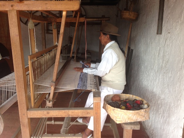 Las distancias son muy cortas. Cinco minutos después, estacionamos frente a una casa galería donde Alberto y su equipo de filmación rodará las escenas para un video promocional de este lugar. De la cajuela del auto bajamos las maletas con las luces, las cámaras, filtros, paneles de rebote, trípodes y demás fierros. Alguien abre la puerta de la galería. La cruzamos en fila india y el olor del tinte y de la tela de los cientos de prendas de vestir, manteles, bufandas, mantas, chalinas y ponchos me invade. Al fondo, otra puerta nos conduce a un patio cuadrado con graderíos y piso de gres. Imagino un gran tablero de juego sin sus gigantes fichas. Pero, más allá de aquel patio, subiendo unas cuantas escaleras, se levanta una pequeña choza. Algo redondeada, con el techo cónico, la vivienda es una réplica exacta que don José Farinango construyó para representar los modos de vida ancestrales del pueblo otavalo. Junto a la choza, se levanta un taller de tejido con los mismos telares que usaron el padre, el abuelo, el bisabuelo y los demás mayores de los Muenala. “Yo hice esto para que no nos olvidemos de dónde venimos”, me cuenta don José, un hombre de setenta años que aparenta tener cincuenta. Su largo cabello cano se deja caer bajo el sombrero, hacia la espalda, atado apenas a la altura de la nuca. Don José es tío político de Alberto. Su esposa, la tía Marina Muenala, va de aquí para allá, luciendo el impecable atuendo tradicional que todos deben vestir para la filmación. En las fachalinas que visten los hombros de las mujeres, todavía se distinguen los dobleces de las prendas que se usan por primera vez.