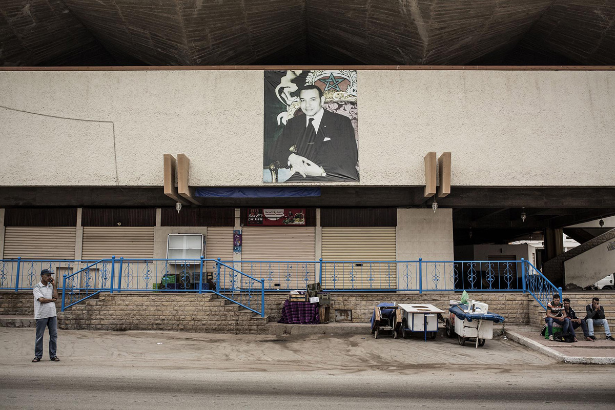 La imagen del rey Mohamed VI está presente en todos los rincones de la ciudad, bares, tiendas y mercados como el de la foto, donde personas sin empleo se sientan a la espera de que surja algún trabajo eventual