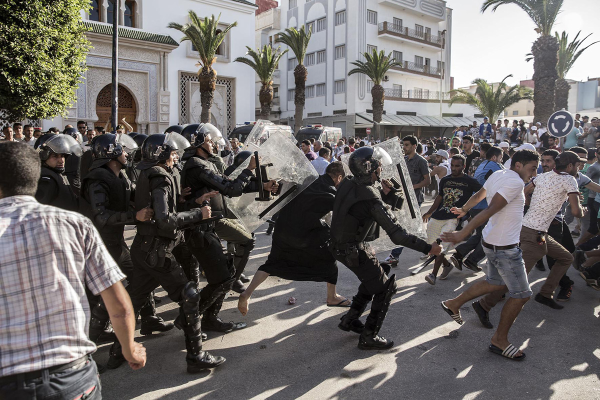 Policías antidisturbios cargando contra los manifestantes el pasado 20 de julio en la plaza Ifriquia en el centro de Alhucemas. Cientos de policías intentaron impedir la protesta, prohibida por el Gobierno, pero la gente se manifestó en todos los barrios de la ciudad.