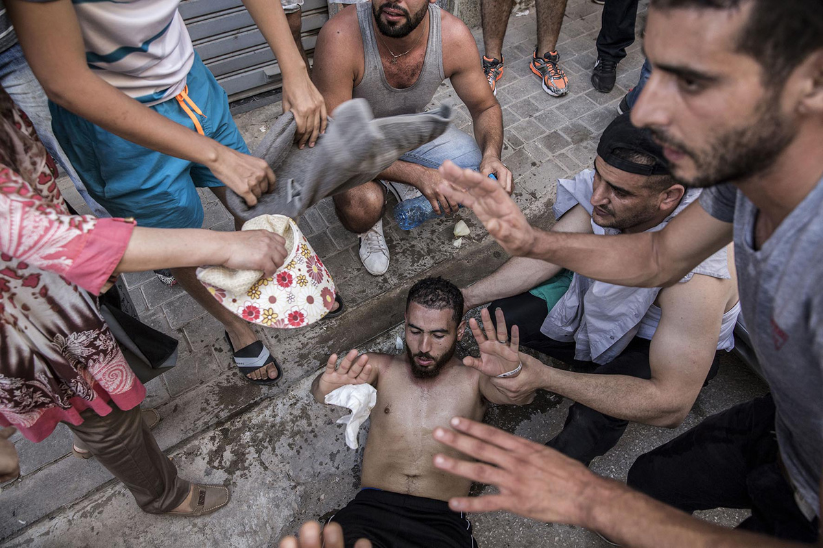 Varias personas ayudando a un hombre muy afectado por la inhalación de gases lacrimógenos durante las protestas del día 20 de julio. A lo largo del día hubo muchos heridos, incluido un joven en estado muy grave por un impacto en la cabeza que tuvo que ser trasladado a un hospital de Rabat en helicóptero.