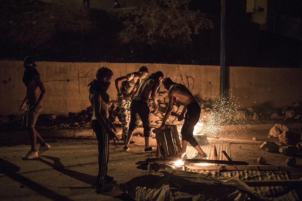 Varios jóvenes haciendo una barricada con fuego en el barrio de Afazar, en las afueras de Alhucema. Dos días después de la gran protesta del día 20 de julio, todavía había enfrentamientos entre vecinos y policías en algunos barrios de la ciudad. (Olmo Calvo)