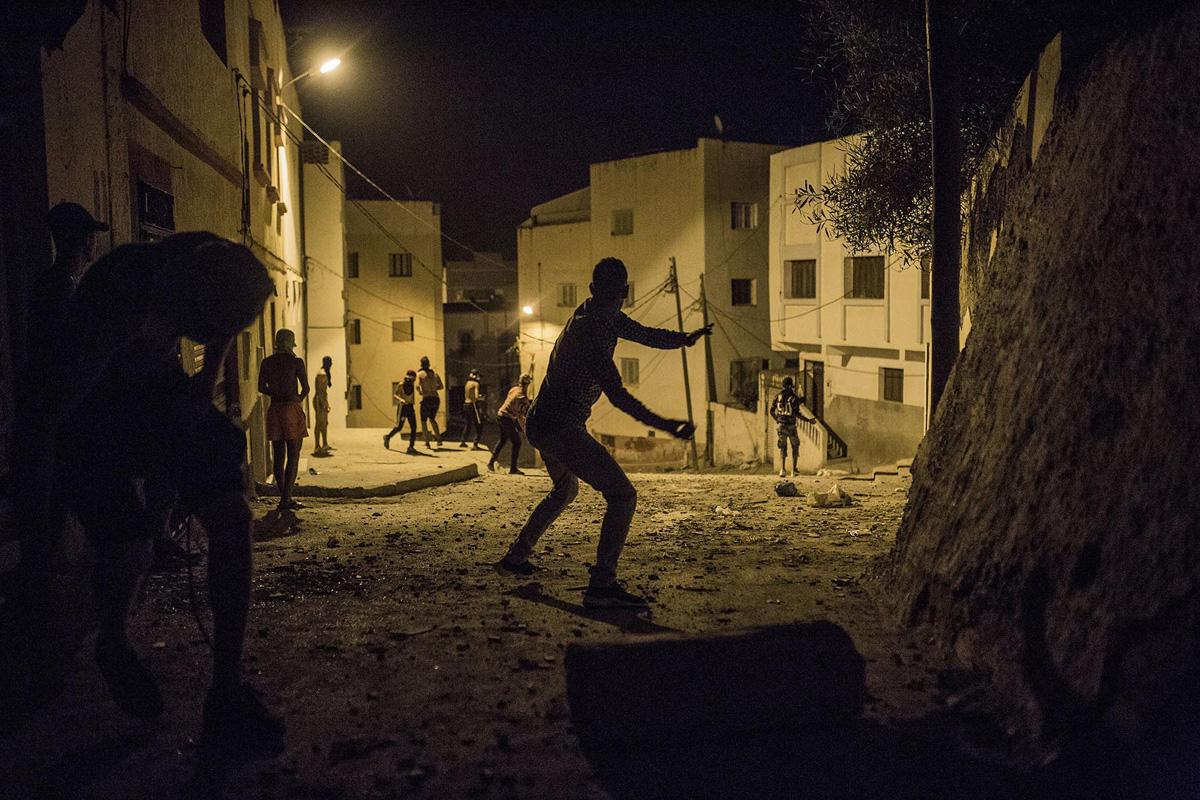 Jóvenes se enfrentan con piedras a la policía en el barrio de Afazar para impedir que entren a detener a activistas del barrio. La policía marroquí entra por las noches o muy temprano por las mañanas para arrestar a la gente en sus casas.