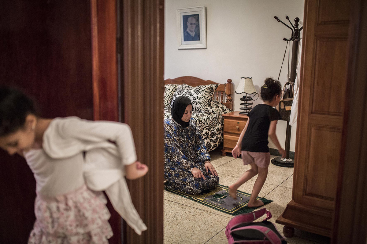 Hodda Sekatti, rezando en su casa, junto a dos de sus hijas, momentos antes de salir para coger un autobús y ver a su esposo El Hannoudi El Habib, preso en la cárcel de Oukacha de Casablanca por participar en las protestas. El Habib es conductor de autobuses y fue detenido cuando terminó de trabajar el 29 de mayo. Desde entonces permanece encerrado junto a más de 200 personas detenidas por protestar.