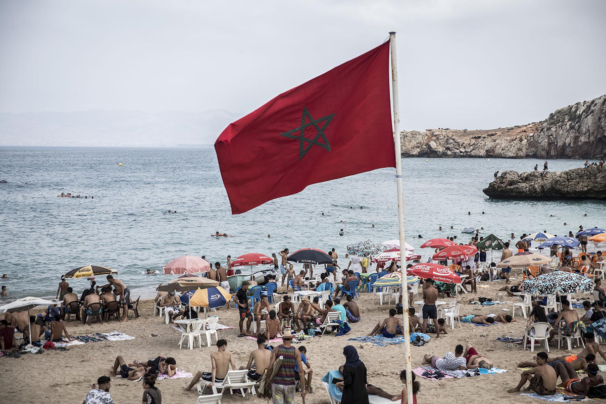 Playa de Carabonita con una gran bandera de Marruecos en medio de la arena. Alhucemas es una ciudad turística, y mientras se suceden las protestas, mucha gente disfruta del mar. Los jóvenes activistas usan también las orillas para denunciar la situación y suelen juntarse en grupos para gritar a favor de las reivindicaciones sociales.
