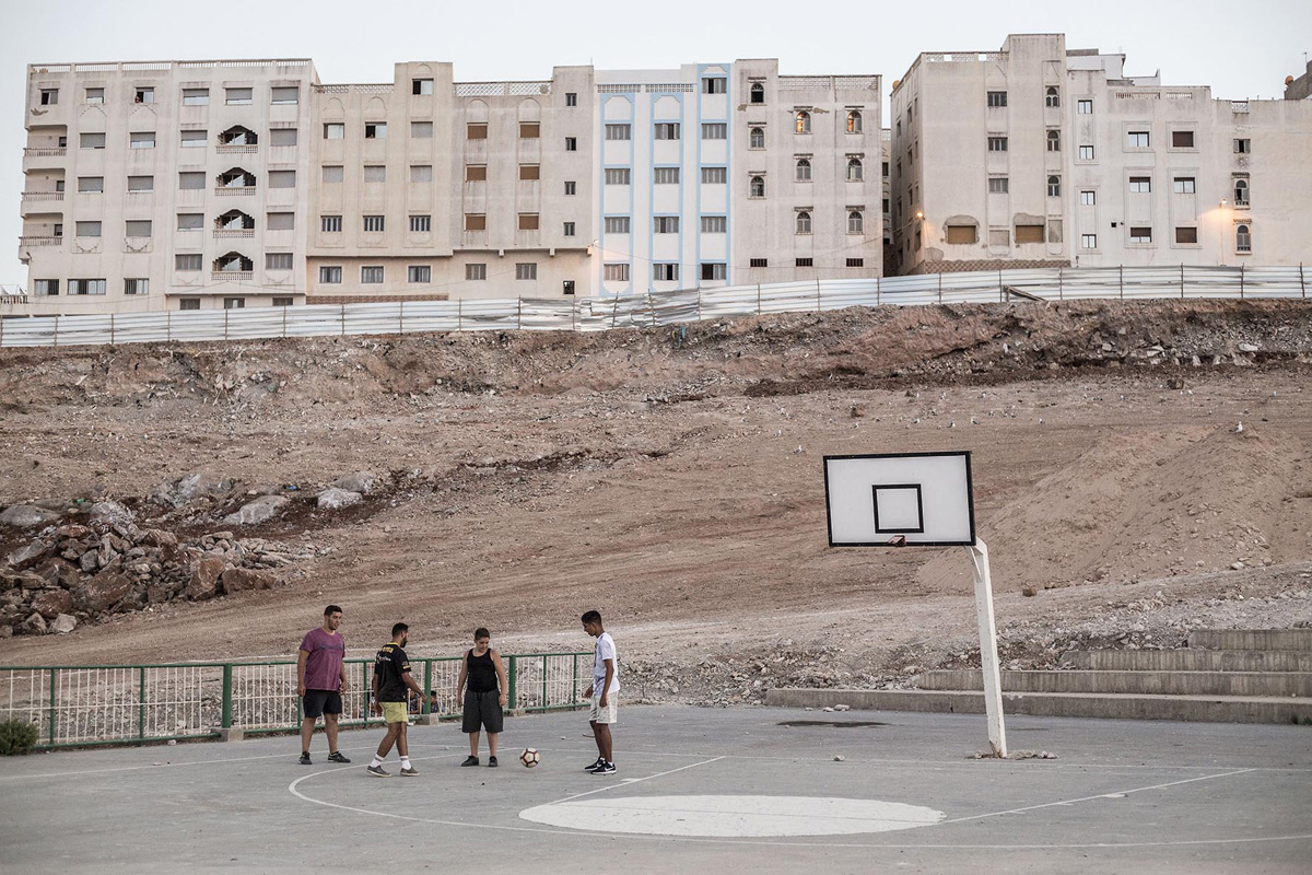 Jóvenes juegan con una pelota en el parque Corniche Morro Viejo, en obras desde hace más de un año. Muchos jóvenes huyen del país en botes de goma hacia España ante la falta de empleo y la represión policial.