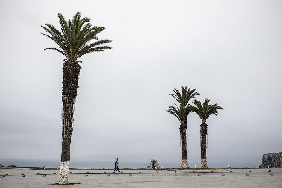 Un hombre caminando por la Plaza de Mohamed VI, en el centro de Alhucemas. Muchos comerciantes y hosteleros se quejan de la disminución del turismo debido a las protestas de los últimos 9 meses.