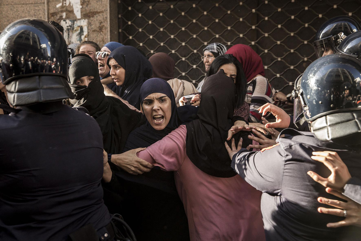 Policías antidisturbios cargan contra un grupo de mujeres que se manifestaban el pasado 20 de julio en el centro de Alhucemas. El papel de las mujeres en las reivindicaciones es fundamental, siendo algunas referentes de las protestas.