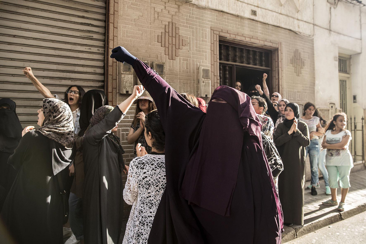 Un grupo de mujeres con el puño en alto grita a la policía durante las protestas del día 20 de julio en Alhucemas. La lucha por derechos sociales tiene el apoyo mayoritario de la sociedad rifeña.