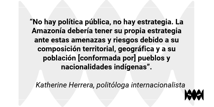 “No hay política pública, no hay estrategia. La Amazonía debería tener su propia estrategia ante estas amenazas y riesgos debido a su composición territorial, geográfica y a su población [conformada por] pueblos y nacionalidades” indígenas, señaló.