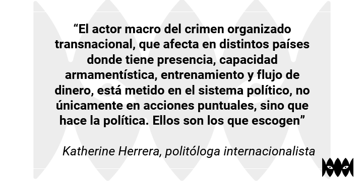 Herrera señaló la falta de acciones estatales en contra de lo que define como “actor macro del crimen organizado transnacional, que afecta en distintos países donde tiene presencia, capacidad armamentística, entrenamiento y flujo de dinero, y está metido en el sistema político, no únicamente en acciones puntuales, sino que hace la política. Ellos son los que escogen”, explicó.