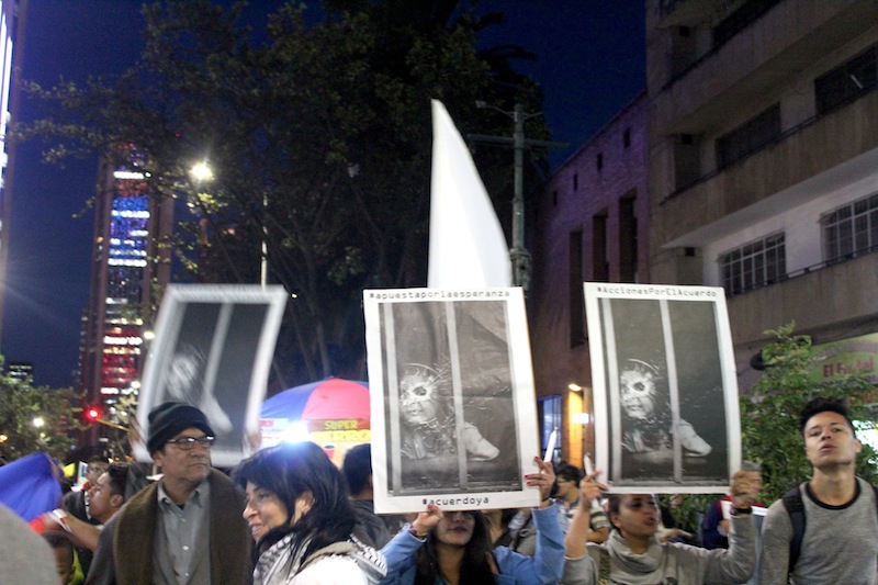 En la plaza hay personas de todas las edades, pero entre ellos se destaca un jovencito de solo 17 años, Pedro Pachón, estudiante del primer semestre de Antropología en la Universidad Nacional de Bogotá. “Vine porque no podemos dejar perder estos acuerdos –dice–, esta es una oportunidad única para Colombia y hay que seguir presionando desde la movilización social, hay que mostrarnos. Nos vamos a quedar hasta que los acuerdos de paz sean implementados en nuestra Nación”.