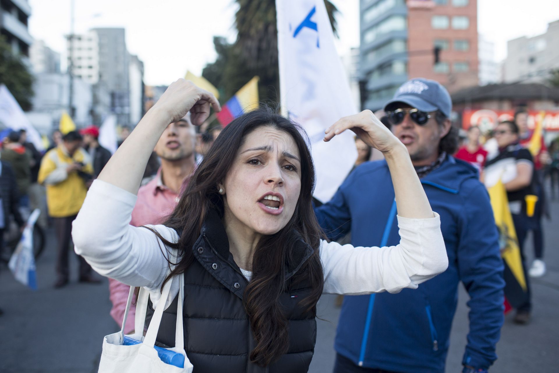 El lunes 3 de abril, los manifestantes opositores esperaban a Lasso en el escenario instalado frente al CNE. Ese día, el candidato aseguró que se impugnarían resultados. Además dijo que, finalizada la rueda de prensa, se uniría a los ciudadanos que decían luchar a favor de la democracia en las calles. La rueda de prensa finalizó a las cuatro de la tarde. Hasta las 5:44 no había rastro de Lasso en los exteriores del CNE y el fervor crecía. Nadie parecía aburrirse. Los comerciantes vendían agua, comida y banderas. Los militares y la policía resguardaban la zona. Andrés Páez, binomio de Lasso, mantenía a los manifestantes entretenidos con sus alocuciones. Alternando con él, varias personas tomaban el micrófono y contaban su experiencia como migrantes, como extranjeros que huyeron de una dictadura, como padres, madres y jóvenes que quieren que la patria tenga futuro. Los reclamos a las Fuerzas Armadas también eran parte del discurso: “¿Dónde están?”, era la pregunta en un país con historia de dictaduras militares, derrocamientos y golpes de estado. Incluso alguien decidió invocar a la “justicia divina”. Las concentraciones de Lasso se caracterizaron por la oración en voz alta. La multitud rezó siempre al menos un padrenuestro cada jornada, como si esperaran que sus plegarias se elevaran hacia ese ser supremo en el que cree o dice creer más del 90% de los ecuatorianos.