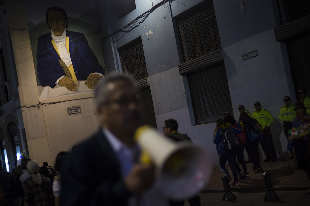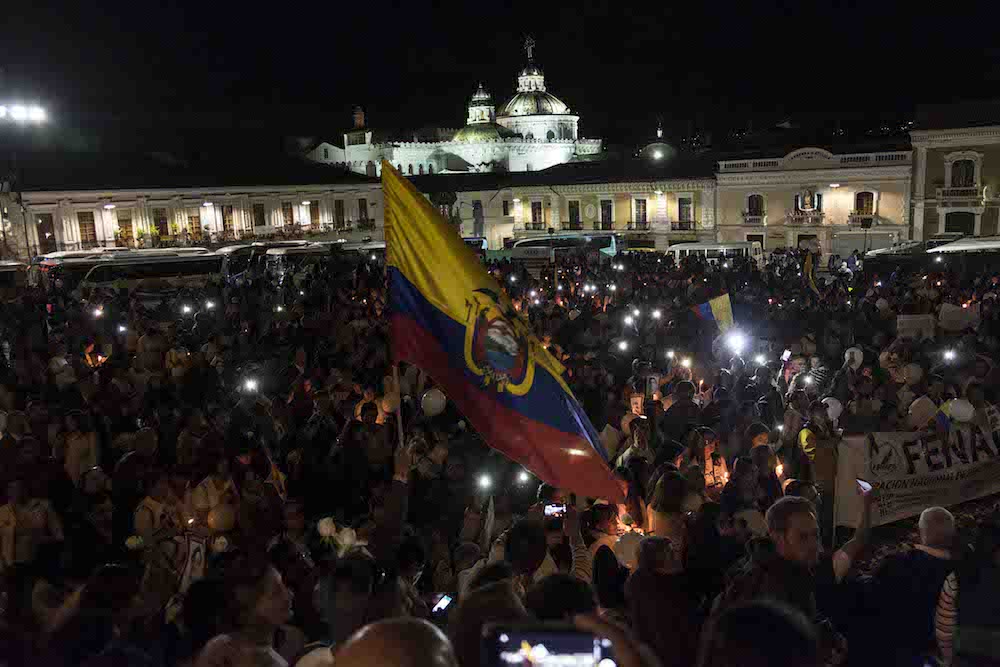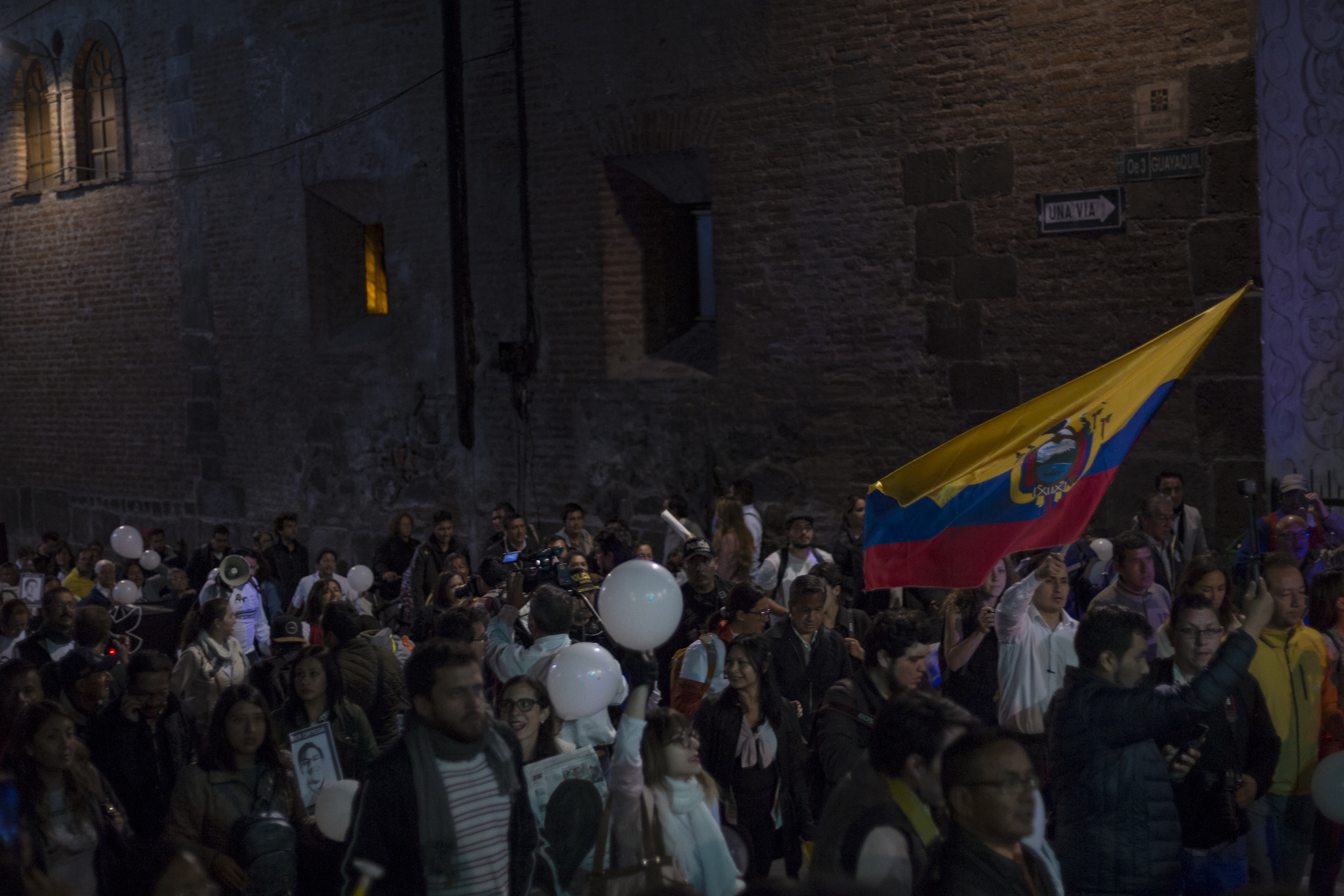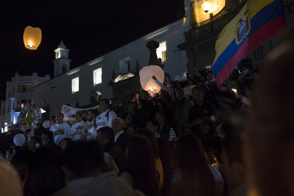 Dos días después de la gran marcha, la noche del sábado 21 de abril, doña María Adelina Velázquez –bajita, muy bajita y cubierta la cabeza con una gorra menos blanca que sus canas– se acercó a un pequeño grupo reunido en la Plaza Grande, al pie del Palacio de Carondelet, la casa presidencial en Quito. La mujer llegó como si tuviera recelo, igual que las otras noches. Habría terminado de vender en ese lugar donde siempre vende dulces y cigarrillos, sobre la calle Chile, muy cerca de la Plaza. Alguien la invitó y alguien más le entregó una vela encendida para que se uniera a la vigésima sexta vigilia. Ella tomó la vela entre sus dedos octogenarios y calladita se quedó, mirando hacia el arreglo de rosas rojas y blancas, mirando a los compañeros de Paúl, de Javier y de Efraín recordarles.