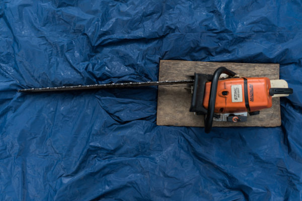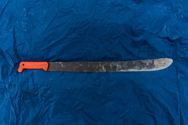 El machete permite entrar a la selva. Con esta herramienta, los campesinos cortan los arbustos bajos y despejan los árboles grandes. Foto: Andrés Cardona.. Después de cortar los arbustos y árboles pequeños, usan la motosierra para derribar los árboles grandes. Foto: Andrés Cardona.