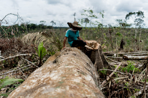 Me encuentro en medio de una tumba con Jairo (46). A él todos le llaman ‘Peluche’. Es sonriente, curioso y gracioso, como un peluche. Jairo está de pie encima de un tronco enorme. Se queda mirando toda la tumba que él ha producido. Está orgulloso por esta área tan grande que él ha limpiado en el bosque con sus manos. 100 hectáreas. Ahora se prepara para realizar la quema. Luego sembrará pasto. Aquí entrarán 100 cabezas de ganado. Es parte de la herencia para sus hijos. El tronco donde ‘Peluche’ está parado es el de un árbol centenario. Me abruma la tristeza. Siento como si estuviera con un asesino que con orgullo me muestra sus víctimas. Los árboles, la selva, los pulmones del mundo. ‘Peluche’ se para sobre el cadáver de uno de los árboles más antiguos de la zona, como un cazador con su trofeo y yo no logro contenerme.