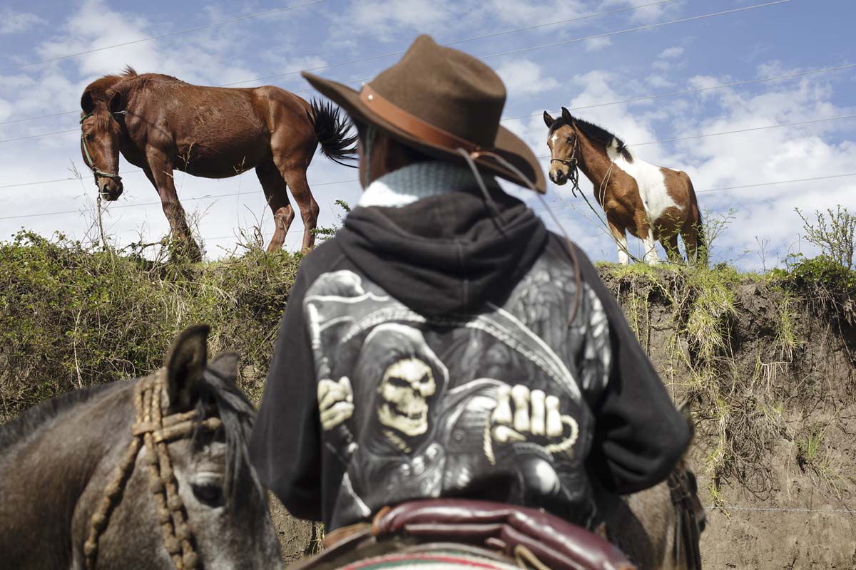 Un joven chagra espera a que inicie el desfile de la asociación de ganaderos en la comuna de Oyambarillo. Oyambarillo, Pichincha, Ecuador. 01/07/2017.