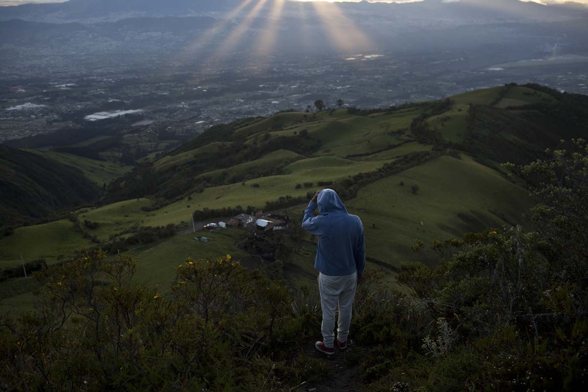 Un joven observa el horizonte en la cima del volván Coturco, sitio sagrado para el pueblo Kitu Kara, a sus faldas reposa la comuna de Oyambarillo. Oyambarillo, Pichincha, Ecuador. 05/07/2017.