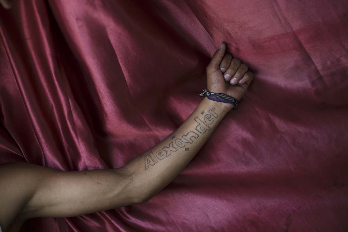 Eric Alexander Tipantusa de 17 años de edad muestra el tatuaje que se hizo hace dos años cuando nació su primer hijo llamado Alexander como él.Eric hace hip-hop imrovisa junto amigos en los patios de la escuela y en las calles, a sus 17 años de edad esta esperando su segundo hijo de otra madre adolescente. Oyambarillo, Pichincha, Ecuador. 07/07/2017.