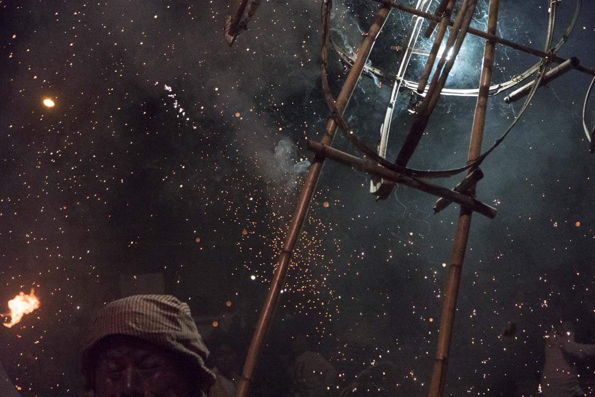 Los juegos de luces son una parte fundamental de la fiesta, le da un signo distintivo a la marcación del ciclo festivo. En la foto tenemos el uso de un dispositivo pirotécnico llamado “chiwawa”, estructura portatil de carrizo que es piloteada por una persona que juega querer chocar y/o rozar a los espectadores, imprimiendo mucha emoción, euforia y alegría. Comuna Tola Chica, Pichincha, Ecuador. 01707/2017.