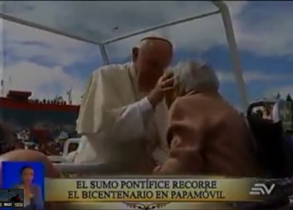 Tomo la posta de la cobertura y por fin puedo voltear a ver. A mi lado pasa un carro de seguridad, le sigue la camioneta en la que va la cámara de la transmisión oficial. Viran muy cerca de mí. Unos metros más atrás, viene el papamóvil. Francisco está saludando y bendiciendo. El vehículo toma la curva, cuando el Papa mira a su derecha y toca el hombro del conductor, quien inmediatamente detiene la marcha. Trato de imaginar qué pasa y lo digo al aire. Me acerco enseguida. Marco ya no me tiene a mí en cuadro. Lo guío conmigo mientras sigo narrando la escena. Detrás de él, y con el teléfono al oído, Claudia hace lo mismo. A la vez, alcanzo a ver que Juan Carlos, Luis y otros dos técnicos se preocupan por el cable, el famoso cable. Sigo caminando y narrando. Paso detrás del papamóvil, lanzo mi mirada hacia la derecha y me topo con varios hombres vestidos de impecable traje negro, saliendo a la carrera de una furgoneta. Vuelvo al frente, observo lo que pasa y entiendo: el papa divisa a la señora de la silla de ruedas que se ha colocado allí hace un par de minutos. Dos escoltas que van a bordo del carro oficial y tres policías toman la silla de ruedas y levantan a la señora hasta la altura donde está Francisco. Nos acercamos más al encuentro entre el Papa y la abuela, pero ese cable que no puede desconectarse –y menos ahora– ya no da más y se tiempla.