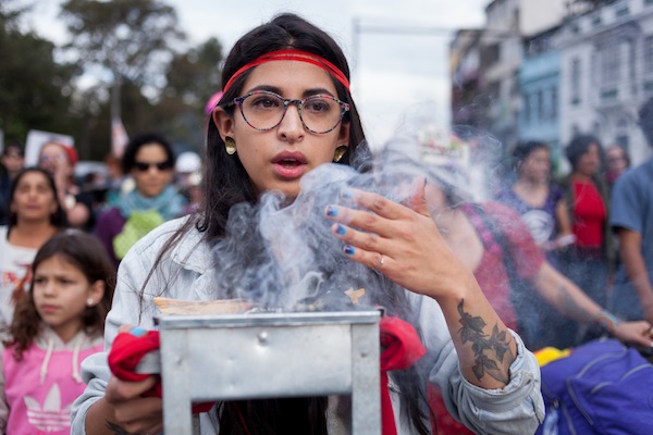 Algo sí podría hacer la justicia respecto de las 4 279 denuncias de desapariciones de mujeres presentadas este 2016 en Ecuador. El dato lo recuerda un cartel que se abre paso entre el humo de palosanto que queman las parteras para limpiar el camino de la marcha. Un refuerzo a la ceremonia que otro grupo hizo para bendecir la protesta en el parque El Arbolito. Diez mujeres que llevan plantas de ruda y lavanda en una mano y escobas en la otra, evocan el asesinato de brujas, siglos atrás.