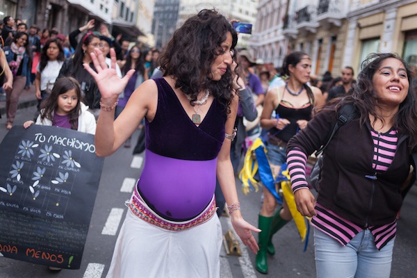 ¡Que viva Quito! Gritó el borracho, confundido por las fechas y la mancha humana que se expandía en la avenida al ritmo de la percusión. Un grupo de mujeres, con pañuelos amarillos y tambores colgados a sus caderas, hacía de la marcha –palabra tan marcial- algo que se podía bailar más bien como un carnaval. Reconocí a activistas, políticas y artistas: