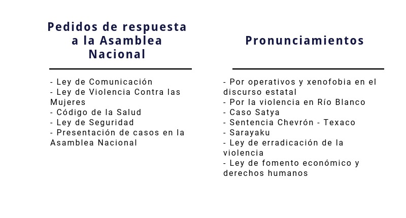 En mayo, el 60% de las atenciones en las que se ocupaba la Defensoría del Pueblo correspondían a trámites de reclamos por mala atención o deficiente provisión de servicios. El 40% correspondía a vigilancias del debido proceso, en los que no se habían emitido informes. Apenas un 5% de las atenciones de la entidad correspondían a activación de garantías jurisdiccionales. Con el propósito de invertir esta dinámica y de «reinstitucionalizar» a la entidad, la Defensora ha diseñado un proyecto de reforma a la Ley Orgánica de la Defensoría del Pueblo «que está basado en la necesidad de que el Estado demuestre que quiere tener una institución sólida en materia de DDHH”.