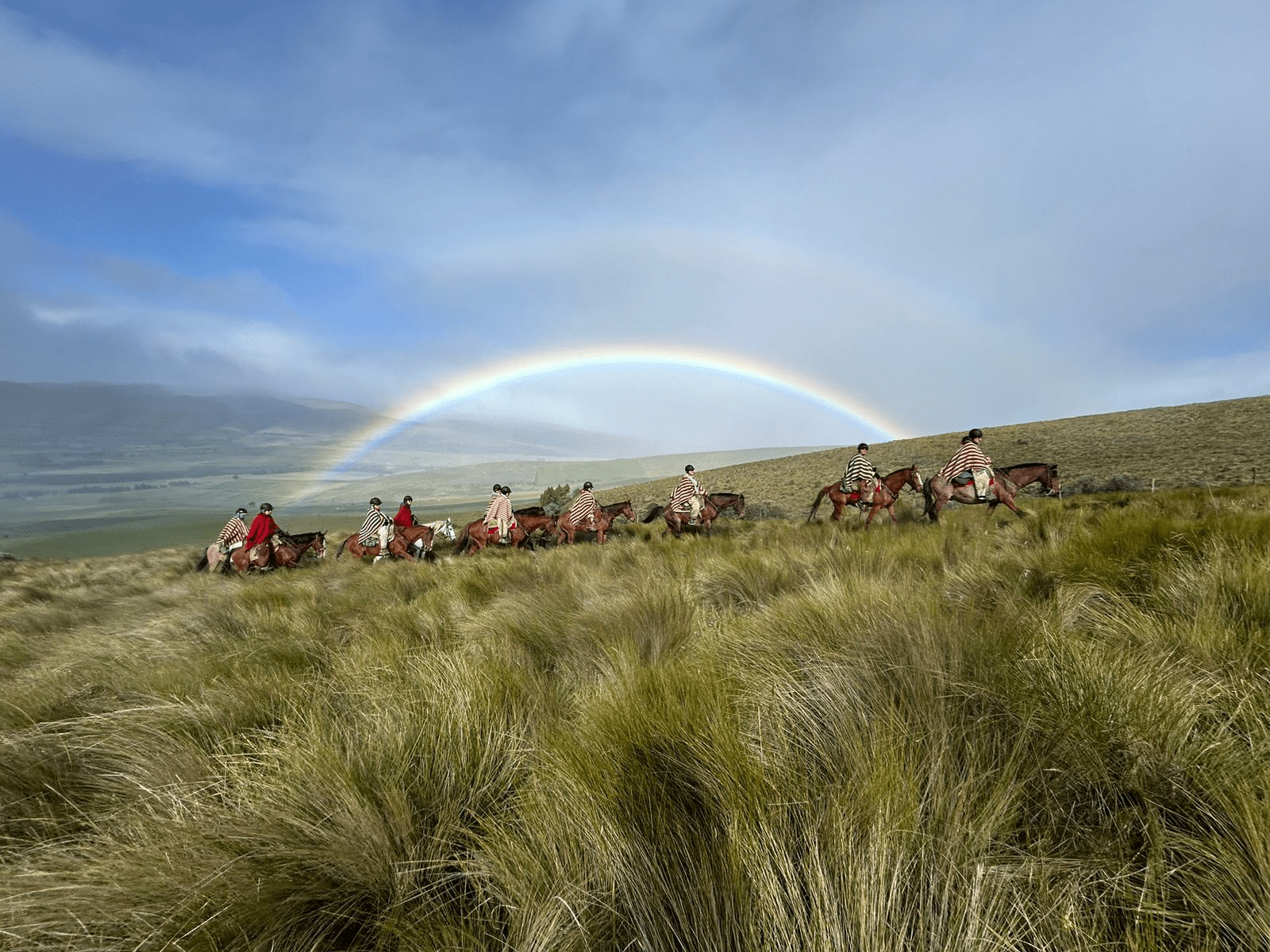 Uno de los legados más preciosos que resguardan es la cultura caranqui. Cada visitante que llega hasta aquí es vestido con ponchos tejidos a mano, bufandas de lana gruesa y sombreros típicos del páramo andino, para luego cabalgar entre frailejones bajo los cielos inmensos. «No solo contamos la historia: la vivimos», dice Troya, con orgullo. Los rodeos de chagras —una tradición ancestral que celebra la maestría ecuestre y el arraigo andino— se siguen realizando cada año. «Es algo único e histórico. Reescribimos la historia, no solo la contamos».