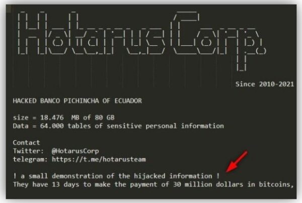 La cuenta de Twitter de @CorpHotarus tenía apenas tres tuits. En un link en la biografía, hay un canal de Telegram. «13 días para hacer el pago o llegar a una negociación para el rescate de información», dice uno de los tweets redactado en un inglés precario. Podría no ser esta la lengua nativa de los extorsionadores.