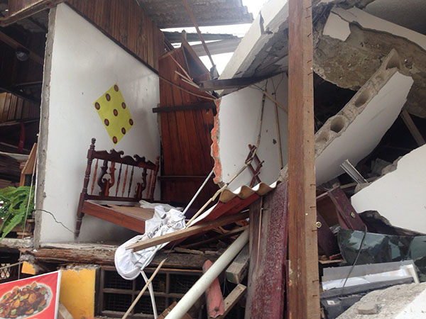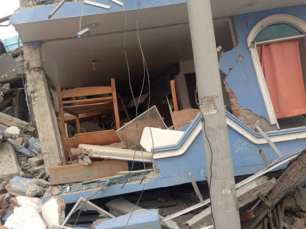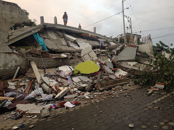 Una casa que alguna vez tuvo tres pisos parecía haberse arrodillado al borde de la carretera. El piso del medio desapareció entre el tercero y la planta baja. Por un costado se veían las escaleras remordidas bajo las planchas grises. “Por suerte, ese era un piso de locales y ya el viernes mismo les habían desalojado a los que ahí trabajaban”, me contaba Esperanza, con un tono nuevo que parecía rendir pleitesía a su propio nombre. Pero ella no había entrado aún a Pedernales y ya se sentía desvanecer.