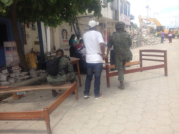 Las operaciones de rescate en Pedernales se concentraron en el Puesto de Mando Unificado, instalado en el estadio Maximino Puertas. El bombero Hugo Parra era el encargado del turno y sostenía una reunión para definir las acciones del personal de Fuerzas Armadas, Secretaría Nacional de Riesgos, Ministerio de Salud Pública, Cruz Roja, Cuerpos de Bomberos y demás organismos de emergencias.