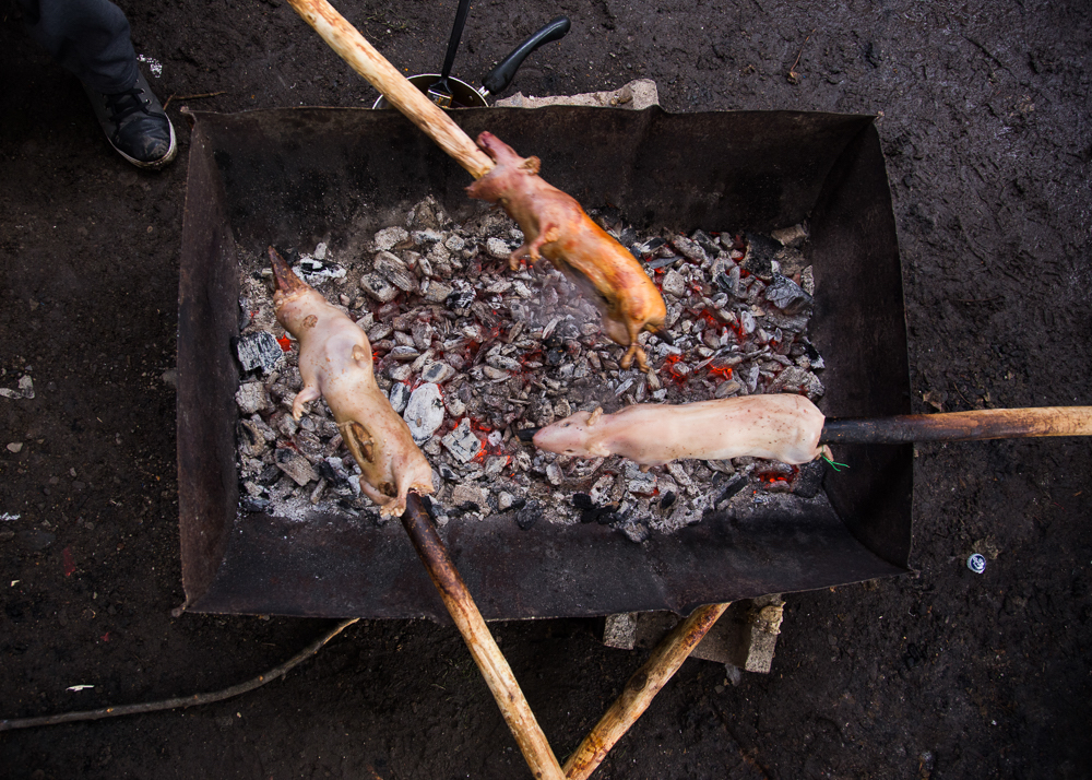 El ritual festivo se inició con la formación de una cruz sobre la mesa hecha de mote, seguida por un padrenuestro. Después, la sopa, el arroz, el quesillo, cuy y pan. Los niños jugaban en inglés con la nieve, mientras el resto tomamos chicha y conversábamos en castellano, hablando con nostalgia de la llaqta y de los taitas. Se veían padres e hijos, porque los abuelos están todavía en Saraguro, en Ecuador. Los mayores enseñaron las tradiciones y protocolos aunque otros detalles se fueron reinventando. En una segunda cena, se prepararon dos distintas mesas, una para hombres y otra para mujeres, como mandaba la tradición. Pero de repente, a todos nos dio ganas de volver a estar juntos, así que compartimos mesa.