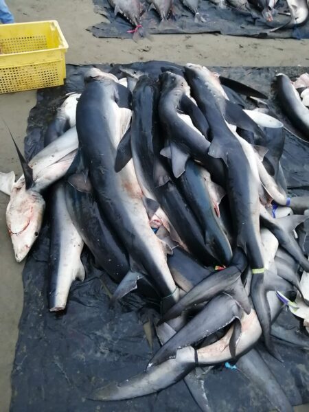 Minuto 13:36. Corre un video. Esas mismas masas grises con vientres blancos son apiladas sobre la arena. Son decenas de tiburones. Un hombre corta las aletas mientras otro sigue apilando los cuerpos. Mucha gente rodea esa montaña gris, lisa, brillante. Sobre la pantalla, con letras blancas, se lee «Video pesca incidental en Manabí».