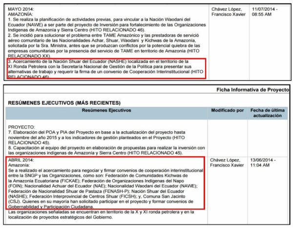 En marzo de 2015, en el cantón de Archidona, provincia de Napo, la SNGP y representantes de varios ministerios asistieron a un evento con el objetivo de “neutralizar los intentos de desestabilización a la actual dirigencia de la NAWE (Nacionalidad Waorani del Ecuador), evidenciando el trabajo articulado del Ejecutivo con la dirigencia”. Una de las diapositivas presentadas a los funcionarios del gobierno en reunión preparatoria decía: “Moi Enomenga, presidente de la NAWE, es un actor estratégico a favor del gobierno en temas de explotación petrolera”.