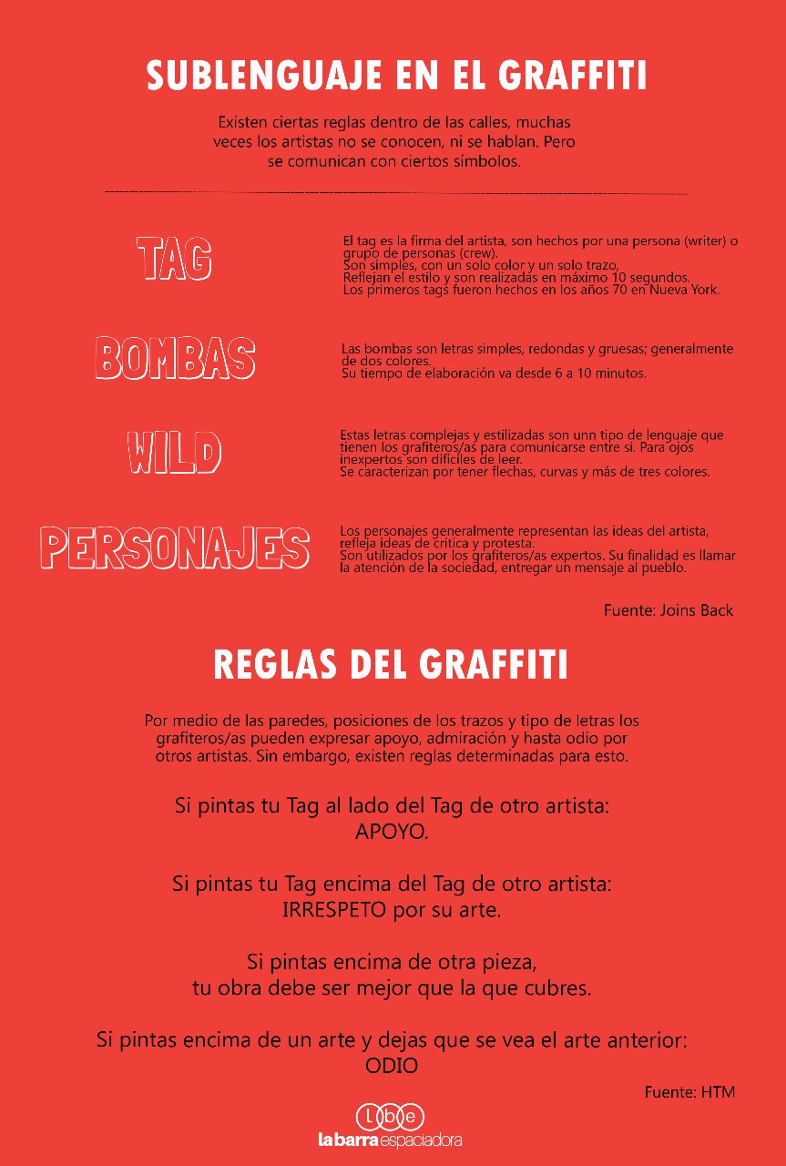 Las letras representan identidad, estilo, y poseen un lenguaje propio. Existen códigos que son utilizados por la mayoría de grafiteros/as, que expresan ideas concretas, apoyo a algún otro grafitero y hasta rechazo. Pero estos sentimientos se expresan de una manera que ha sido creada para entenderse entre los artistas de la calle. La mayoría de grafiteros crea alias. Estos tags que vemos por las calles tienen su propio lenguaje.