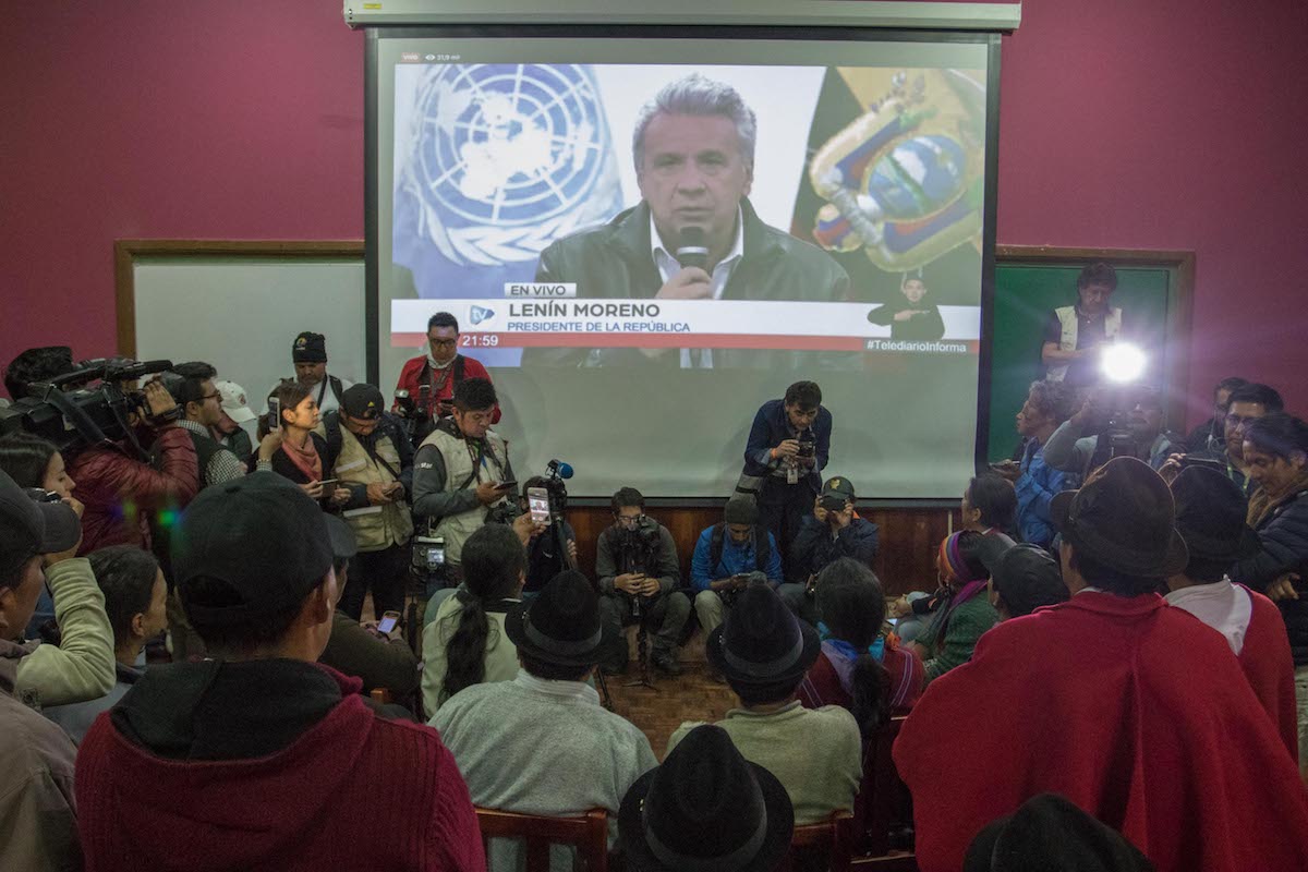 El guión es claro: primero, el presidente declara su afecto y las cosas que ha hecho por el sector campesino. Este es su punto de partida para encontrar una cercanía. Luego trae a colación lo que ambos —el presidente de la república y el presidente de la Confederación de Nacionalidades Indígenas del Ecuador— tienen en común: un enemigo. La avanzada presidencial demuestra conocimiento de las leyes básicas de la Conflictología. Luego, Moreno acepta las palabras indignadas de los dirigentes sin mostrar cambios en su expresión facial. Cuando se habla de muertos, es mejor, al parecer, callar. Aunque podría argumentar, elige no hacerlo. Sabe que debe ceder en ese punto. Se controla, pero hay tensión en su cuerpo. ¿Enojo reprimido? Esos muertos y ese sufrimiento son el punto de partida para legitimar el pedido de los campesinos: derogar el decreto que elimina el subsidio a los combustibles, a lo que suman el despido de dos ministros. Aunque se menciona al FMI, esto no parece importarles tanto. Para ellos las “realidades financieras” no son realidades concretas. Les importa más que la vida no suba de costo y sacar adelante algunos proyectos ofrecidos y postergados.