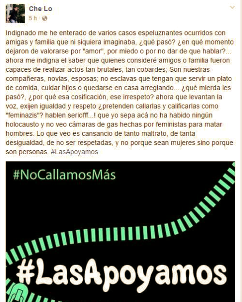 Sobre la gráfica que circuló en redes sociales como apoyo a la campaña, Kika dice que “es justamente lo que se está pidiendo”. Además, demuestra gratitud frente a esa iniciativa. Daniela, en cambio, duda sobre si ese es el sentido: “el pedir apoyo”. Ella cree que es mejor que los hombres no solo se sensibilicen ante la violencia a la mujer sino que acepten que el machismo también los violenta, dado que la sociedad ha creado un rol específico para el hombre: “les impone que no lloren, que no jueguen con muñecas, que sean únicos proveedores económicos del hogar, que se peguen entre ellos -o peguen a mujeres-, para demostrar virilidad, que solo se puedan vestir de una forma, que no limpien la casa, que no cuiden a los hijxs, que tengan que hablar de una forma, que no se puedan dar un beso entre amigos porque eso les hace ‘maricas’”. Daniela dice que esto “no es como apoyar a los damnificados del terremoto, por ejemplo. (…) se debe ir más allá”.