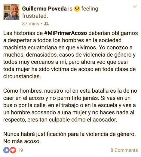 En Ecuador, las cifras del Instituto Nacional de Estadísticas y Censos, indican que 6 de cada 10 mujeres en algún momento han sido víctimas de cualquier tipo de violencia, ya sea esta física, sexual, psicológica o patrimonial. Es por ese contexto que a Daniela Game, psicóloga y consultora en política pública, quien también compartió su historia en el grupo mas no la hizo pública en la fan page, le entusiasmó “pensar que un ejercicio de romper el silencio y solidarizarnos entre mujeres se replique en el Ecuador, donde todavía el debate público al respecto es mínimo”.