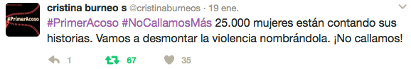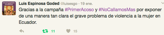 La respuesta –o una de ellas– se ha hecho presente durante las últimas dos semanas. #PrimerAcoso #NoCallamosMás es una iniciativa de un grupo de feministas ecuatorianas que buscan que los casos de violencia hacia las mujeres no queden en silencio. La campaña surge en el contexto de que, en Ecuador, en los primeros días de este año, ha existido una alta tasa de femicidios. Por otra parte, las organizadoras se inspiraron en campañas similares en Brasil y México.