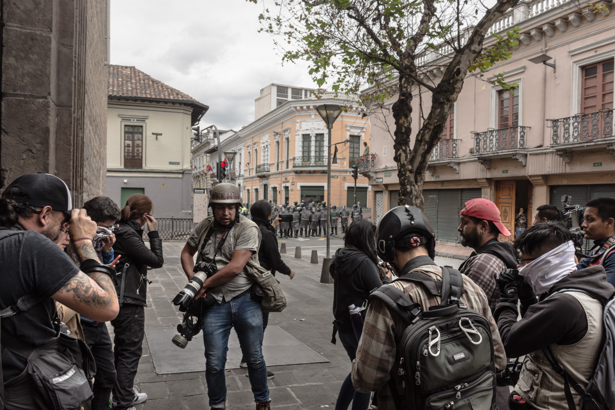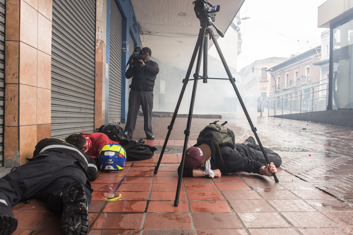 Una imagen captada durante la primera jornada de manifestaciones, en Quito, el pasado 3 de octubre, se volvió viral. Dijeron que se trató del «primer muerto» durante estas protestas, pero eso era mentira. «Mi trabajo empezó desde tempranas horas –relata el estudiante y fotorreportero Esteban Quiroz, autor de la fotografía–, los puntos de encuentro fueron la Universidad Central del Ecuador y el Centro Histórico. Me uní a la manifestación a la altura del edificio Benalcazar 1 000, avanzamos con un grupo de personas hasta el centro y la concentración de la manifestación fue en las calles Guayaquil y Olmedo. Entre los manifestantes se encontraban jóvenes universitarios, movimientos políticos y también periodistas y fotógrafos para quienes su único objetivo era registrar lo que en ese momento estaba ocurriendo».