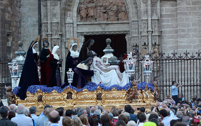 Alrededor de 30 costaleros sostienen cada plataforma o paso. El paso soporta una imagen religiosa específica y se viste con faldones de terciopelo. Hasta 116 pasos recuerdan la pasión, muerte y resurrección de Cristo y cada representación es un espectáculo particular en las calles sevillanas. La peana, en cambio, es una canastilla de madera noble, tallada al estilo barroco, y adornada con flores, candelabros iluminados, faroles y, por supuesto, con las imágenes.