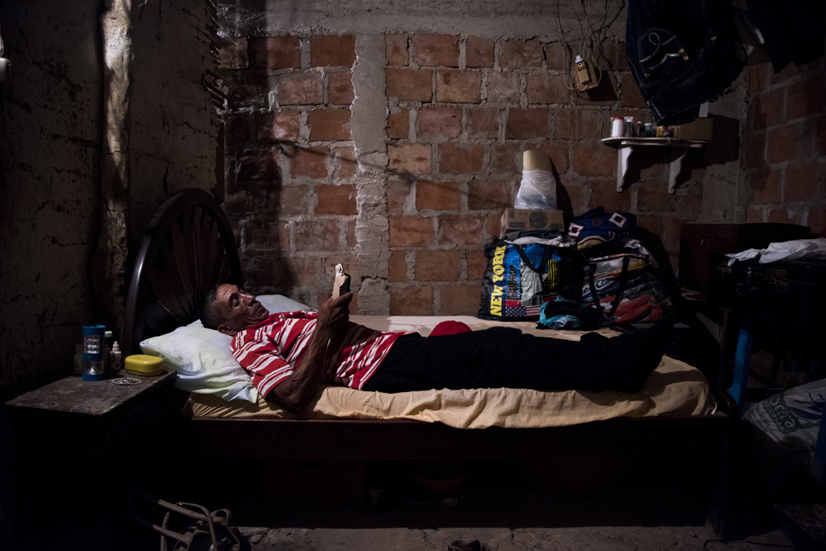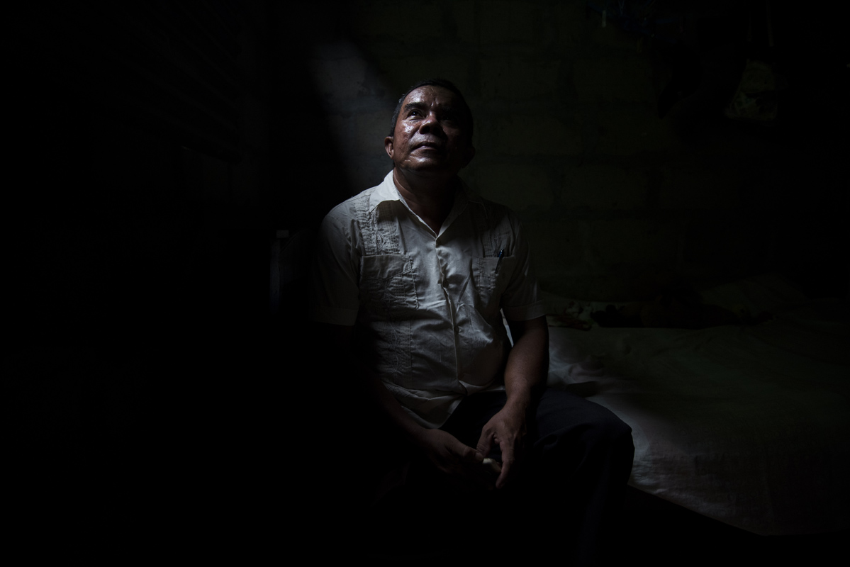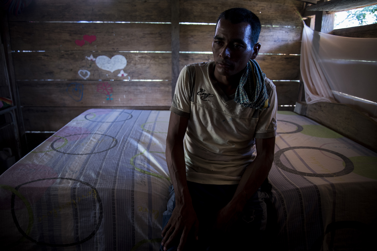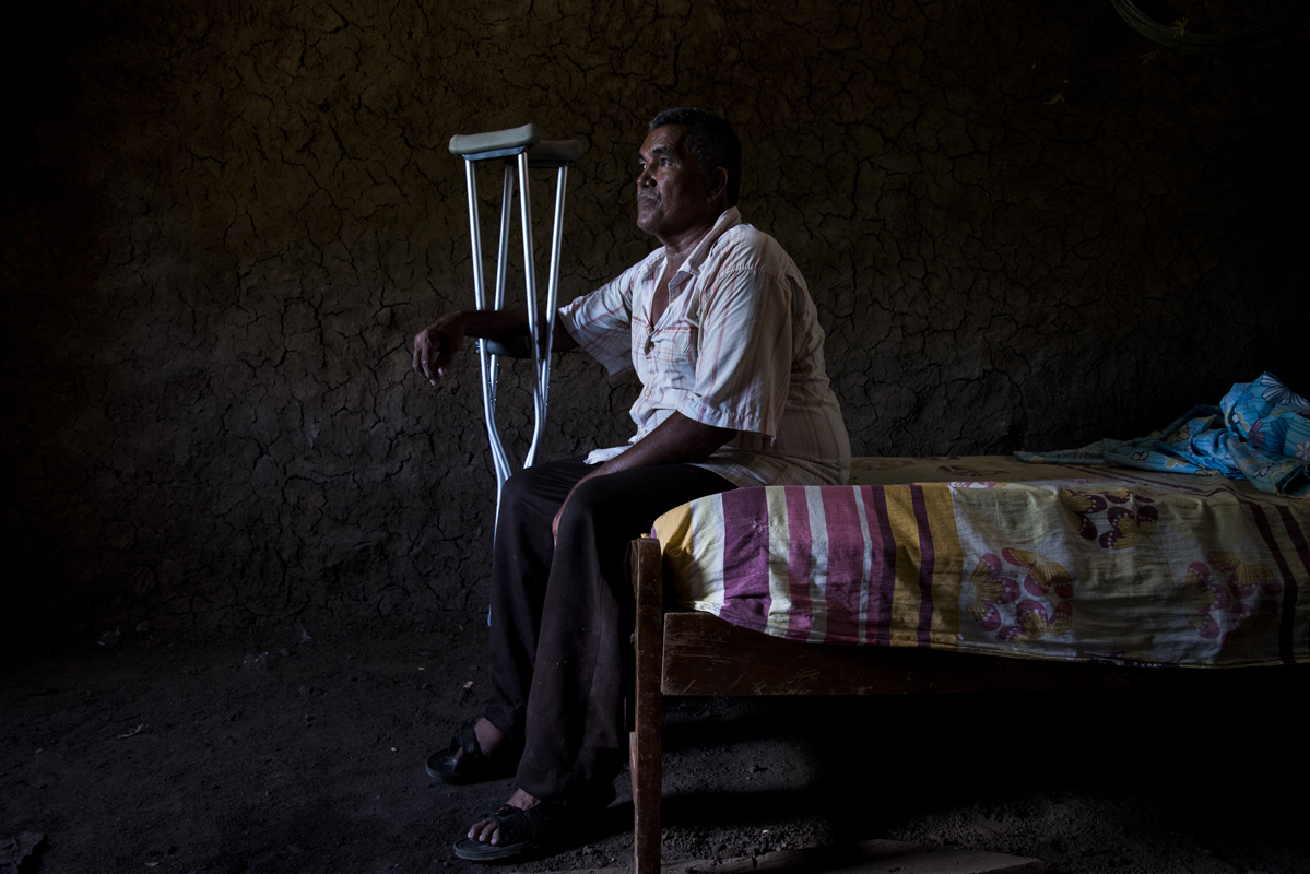 Rafael Alonso Miranda, un ganadero de 63 años, perdió su pierna a causa de un cilindro bomba que cayó al lado de su casa, en medio de enfrentamientos entre las FARC y el Ejército. A pesar de eso nunca dejó su hogar en Bellavista, Magdalena. Ahora en muletas espera salir adelante en su casa a medio construir.