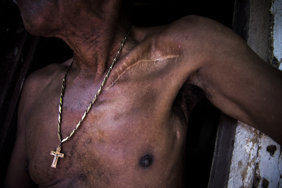 Rodolfo Pacheco (nombre ficticio), de 70 años, vive en El Carmen de Bolivar, uno de los pueblos más afectados por el conflicto armado. El 6 de enero de 1999 fue herido de bala en medio de un combate de las FARC y el Ejército. Lo que quedó de ese día hoy vive consigo: cuatro marcas corporales con las que no nació.
