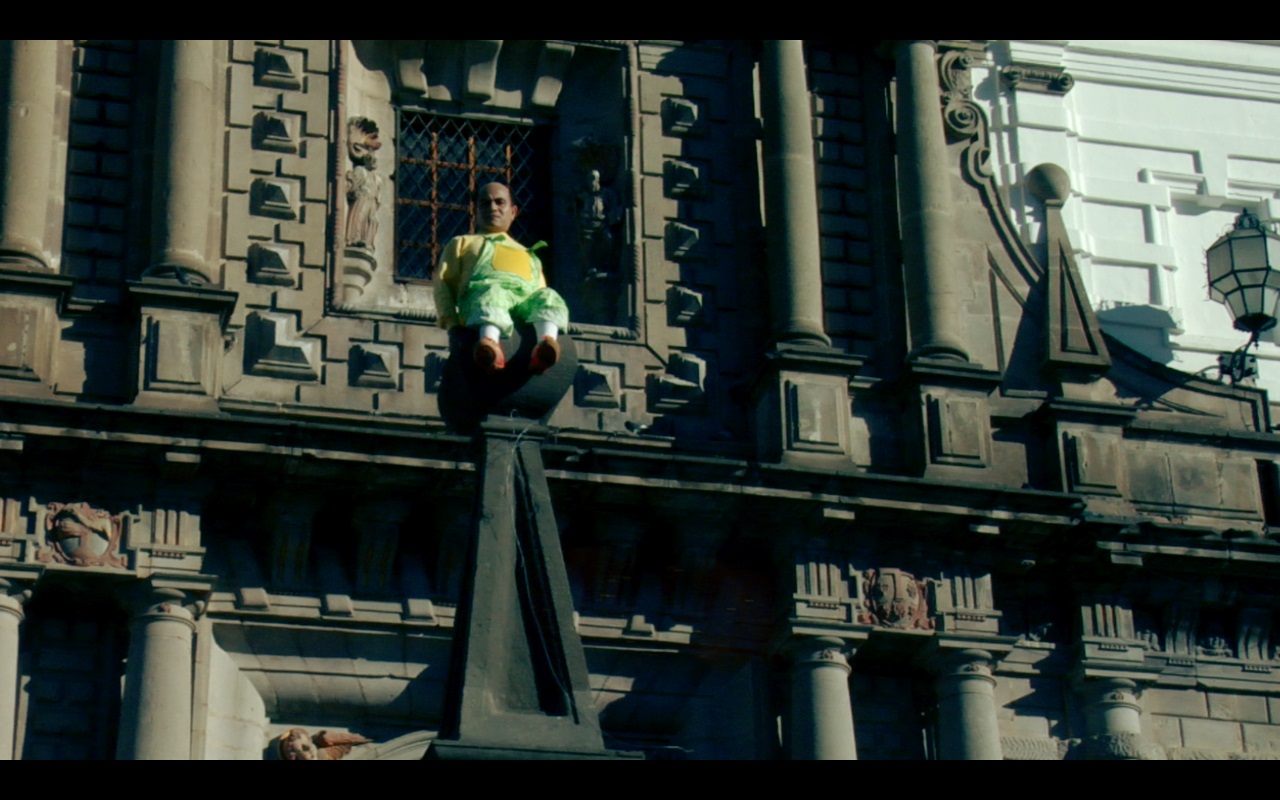 Una secuencia que se desarrolla en el Centro Histórico de Quito me sirve para continua: la cámara y el uso de lentes angulares buscan separarnos de la realidad cotidiana. Se trata de un recurso que deforma nuestra percepción, pero se vuelve muy evidente por la composición de los planos y el movimiento de cámara. Parece que los personajes fantásticos están en el lugar equivocado de la imagen. En general, la fotografía no fortalece un relato tan particular como este y descuida un elemento tan vital como el color.